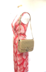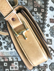 Featuring a gold tone carriage logo motif(partially showing tarnishing) on the flap closure and horsebit motifs at both sides. Another round logo charm to the the riri zipper to the pocket inside.