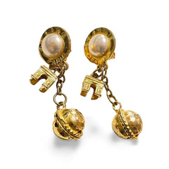 1990s. Vintage Celine golden round frame faux pearl dangle earrings with triomphe and golden ball charm.
