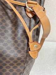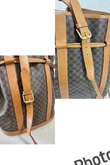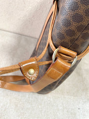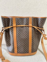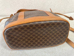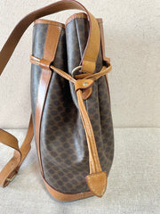 Vintage Celine hobo bucket shoulder bag in classic brown triomphe pattern with leather straps.