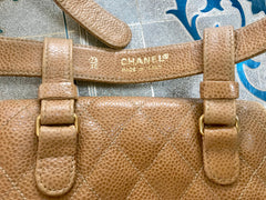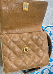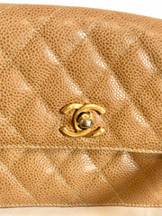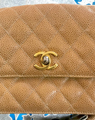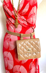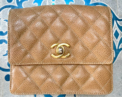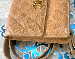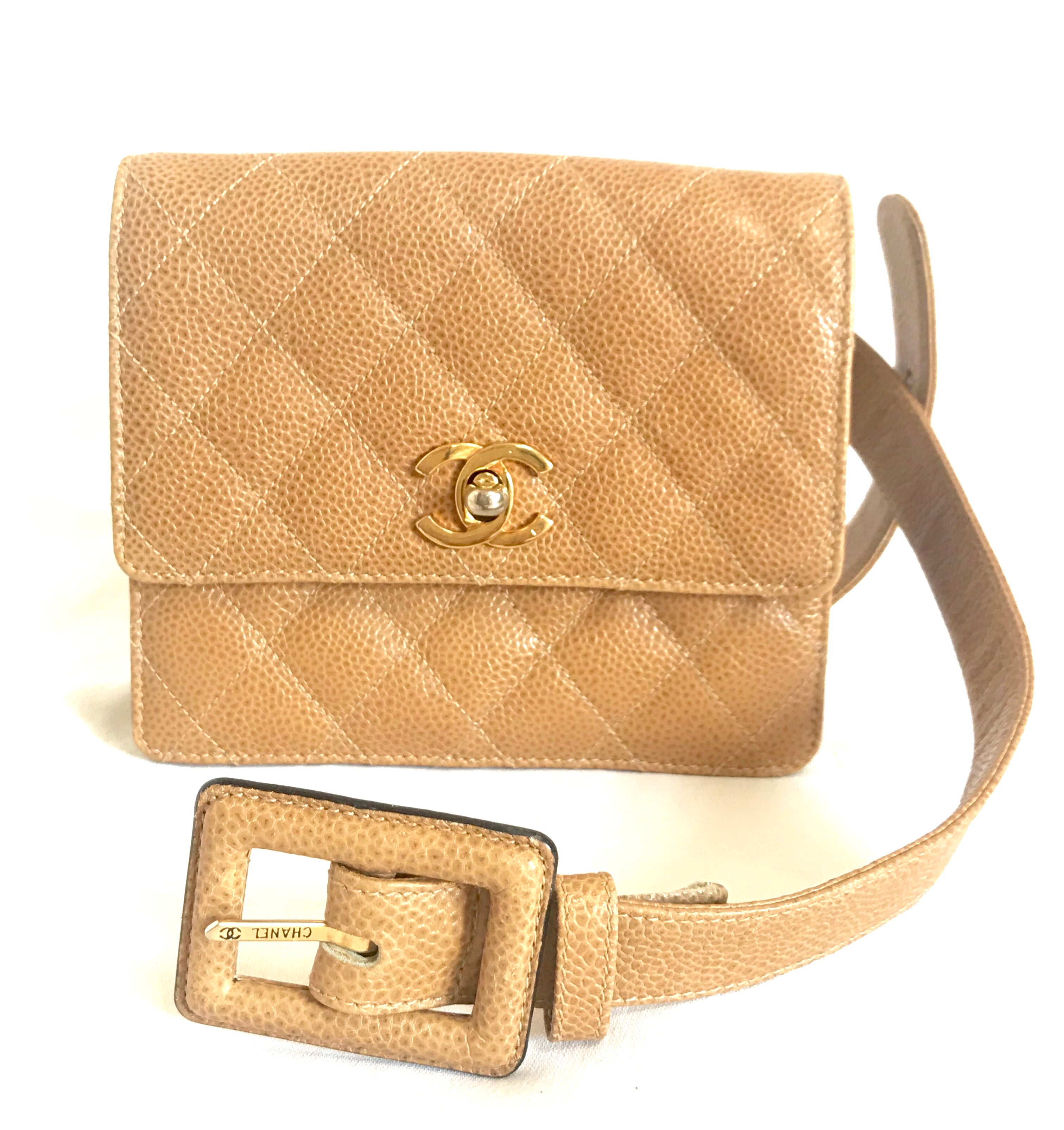 Introducing a vintage CHANEL beige brown caviarskin waist belt purse, fanny pack in square shape 2.55 bag design.