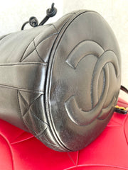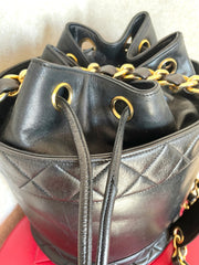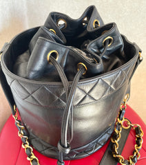 1990s. Vintage CHANEL black lambskin bucket hobo drum shoulder bag with golden chain strap, CC mark, and drawstring.