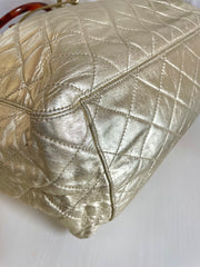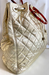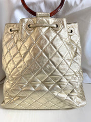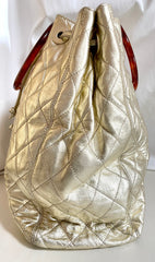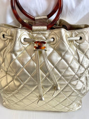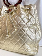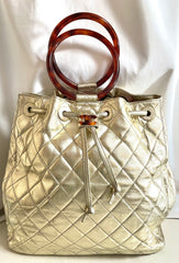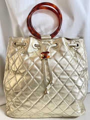 1990s. Vintage CHANEL campaign gold lamb leather hobo bucket bag with marble hoop handles and turn lock CC. 0412081