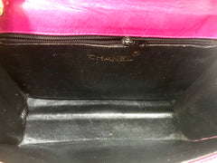 Vintage CHANEL hot pink genuine lizard leather envelope style flap shoulder bag with a stitched CC mark and golden chain strap.