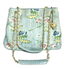 Introducing one-of-a-kind, rarest vintage CHANEL bag, a blue leather and Japanese Kimono/Obi design jacquard fabric combination chain shoulder bag with golden CC ball charm.