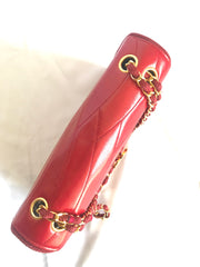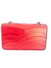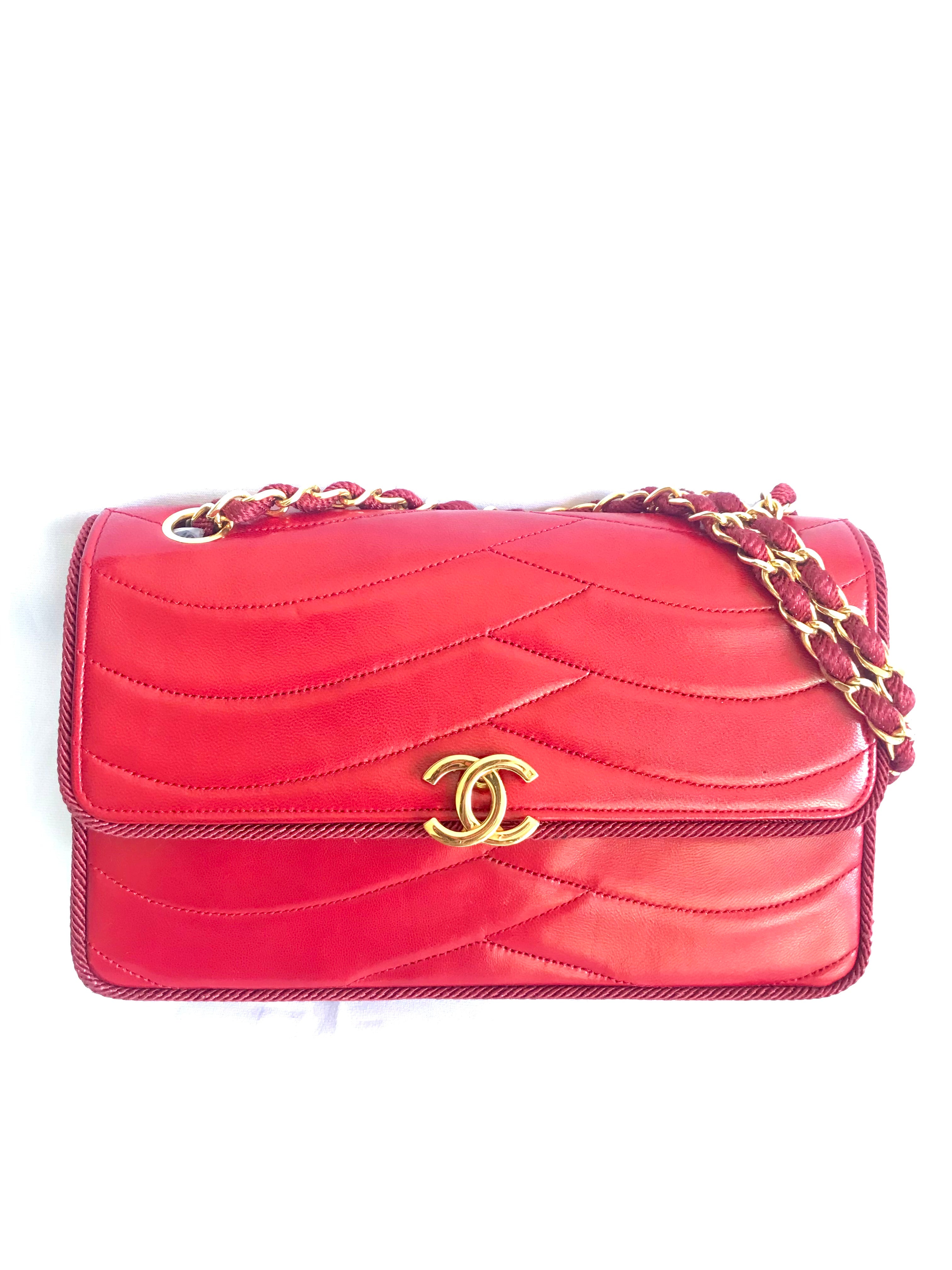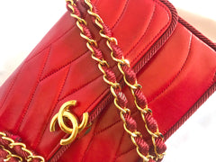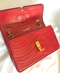 Vintage Chanel red 2.55 shoulder bag with wavy stitches and rope strings and gold chain strap. Very rare piece from the old era.
