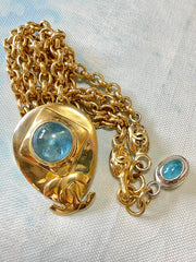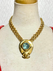 Featuring an oval pendant top with light blue gripoix glass stone and CC mark.