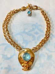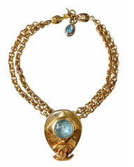 1990s. Vintage CHANEL double chain necklace with gripoix blue stone and CC mark top. Double chain necklace.