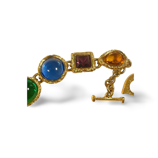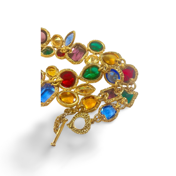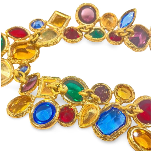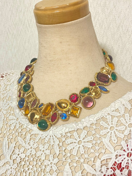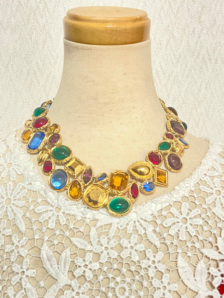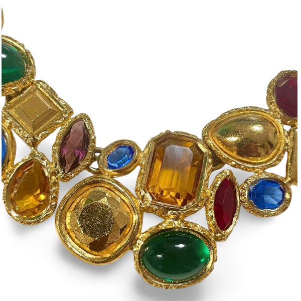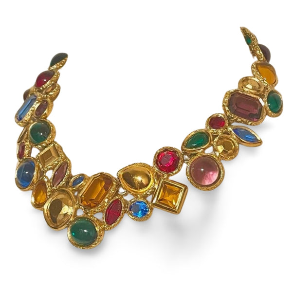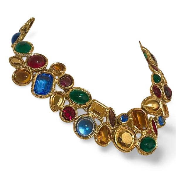 Elevate your collection with this stunning 1990s Yves Saint Laurent statement necklace, showcasing an artful mosaic of multicolor Gripoix glass stones set in rich, textured gold-tone metal.