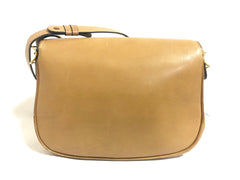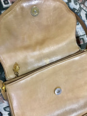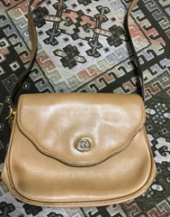 1980s. Vintage Gucci nude brown leather shoulder bag with golden and silver tone GG logo motif and wavy design flap. Classic purse. 060716r