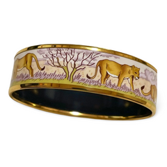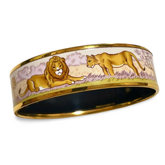 Vintage Hermes cloisonne enamel golden bangle with lion couple design. Classic Hermes GM bracelet.