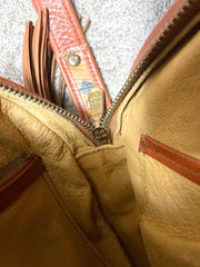 Featuring a logo embossed leather patch on both sides and fringes at sides.