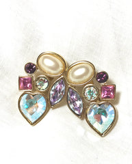 1980-1990s. Vintage Yves Saint Laurent crystal and pearl earrings. Must have jewelry piece. Heart, pink, purple, pearl stones.