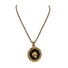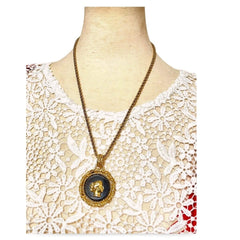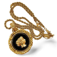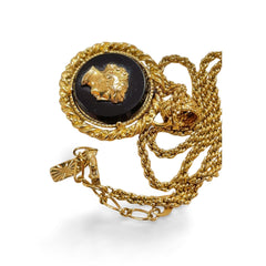 Vintage Yves Saint Laurent golden chain necklace with golden and black Elizabeth cameo design pendant top.