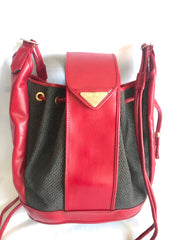 Introducing another vintage piece from Yves Saint Laurent, red and grey tone shoulder hobo bucket bag with leather trimmings and the triangle shape logo embossed hardware in 90s.